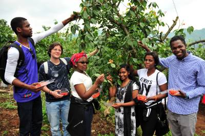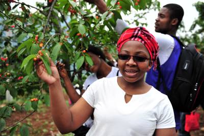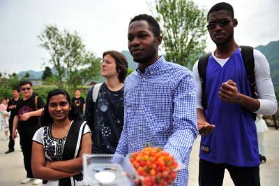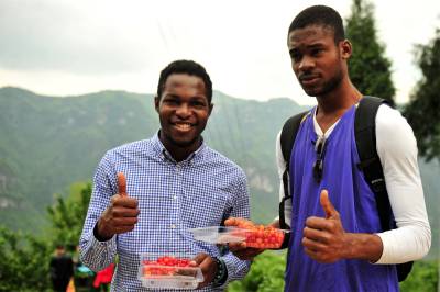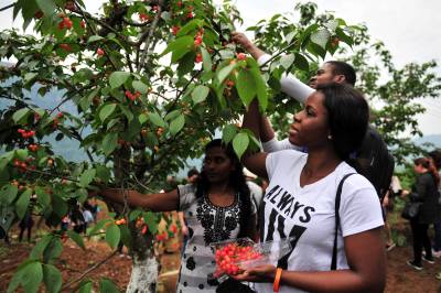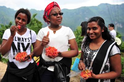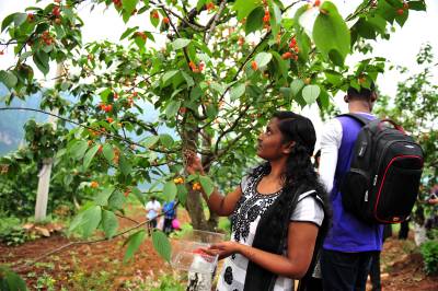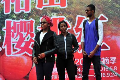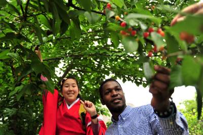 2016年4月24日,外国游客在宜昌市夷陵区黄花镇富裕山一带的生态果园里体验采摘樱桃的乐趣。眼下正值樱桃成熟季节,宜昌市夷陵区乡村生态果园里樱桃果红诱人,除了当地游客,更是吸引了国外宾客入园亲手采摘鲜果,体味农家田园生活的乐趣。