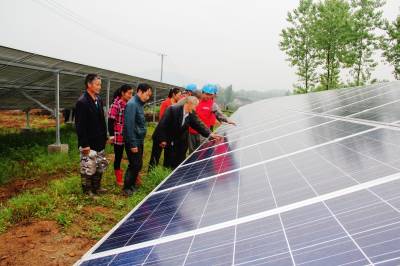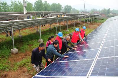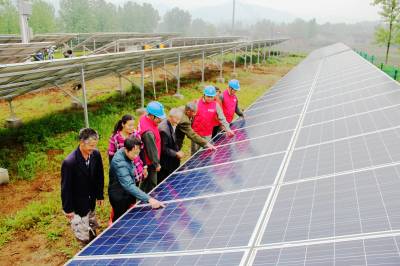 精准扶贫助农富 4月25日,谷城县供电公司员工在和农民一起参观新建的光伏发电站。该公司投资50多万元,助力五山九里岗村26户贫困户年平发电收入9000多元。 视界网马明刚摄