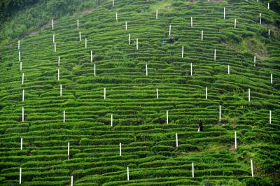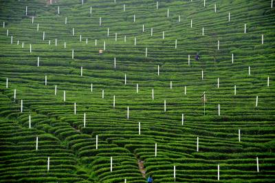 4月25日,游客在三峡库区秭归县九畹溪镇界垭村高标准茶叶示范园内游玩赏景。