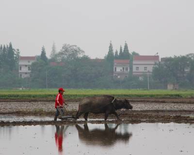 2016年04月24日,云梦县道桥镇农民赶着耕牛用“耖”在水田“耖地”,为插秧做准备。耖 ,是水稻种植地区一种多齿的农具。耖地,过去是水稻种植地区乡村的一种必不可少的农事。耖地,是在耕、耙地以后用“耖”让耕牛拉着,把田地的泥土弄得更细、让地更加平整。眼下,这种农事日渐消失。在云梦农村,北部已经见不到耖地的踪影了,过去水稻地的插秧如今被旱地“打撒谷”替代,农民也不用到水田插秧了。只有在云梦南部,还可以见到“耖”这种农具,可以看到插秧前农民赶着耕牛“耖地”的农事活动。在云梦南部水稻地区,过去的“耖地”而今部分被拖拉机“耖地”而替代,只有部分农民依旧用耕牛拉着耖子耖地。随着农事的变化,种植耕作方式的改变,农业机械化程度的不断提高,耖地这种农事活动不断弱化消失,“耖地”将日渐消失成为历史,成为人们的一种记忆。