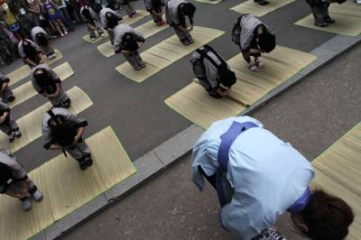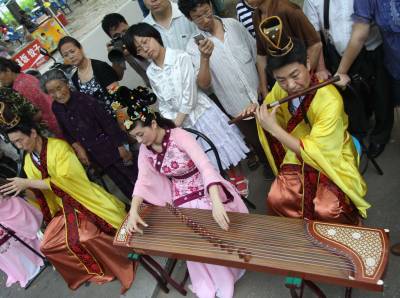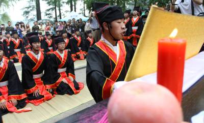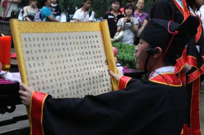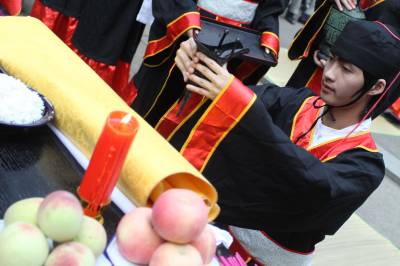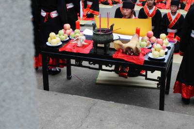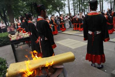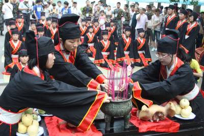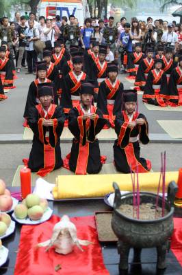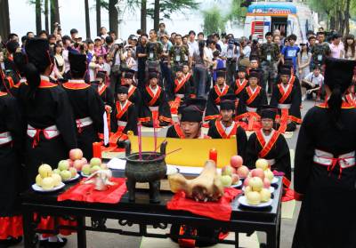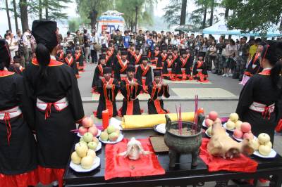 2010年6月15日,湖北武汉,50余名武汉大学国学班的大学生和30余名童学馆的小朋友,在东湖行吟阁前举行”屈原祭祀”活动,缅怀伟大的爱国主义诗人屈原。据了解,屈原祭祀活动分为5个部分:首先,赞礼官唱”行初献礼”声中,祭祀正式开始。4名乐者在祭台前以笙、笛、萧乐器演奏起《楚商》曲,祭者在执事官引导下,向屈原的雕像”初献”:进香进酒并叩拜,再由祝者高诵祭文。其后的”亚献、终献、饮福受胙、望燎”仪式中,身着楚服的国学班学子神色肃穆,共起叩9次,祭文最后一句”神而有灵,其维尚飨”由学子齐诵。