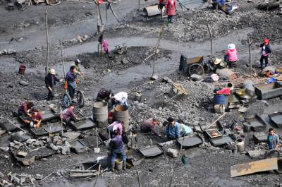 自主矿区筑墙保护后,山前鲍峡镇矿渣场扒矿渣捡绿松石的村民减少。山后胡家营洄水沟村成了扒矿渣捡绿松石的主战场,村民架水管从山下抽水几公里上山,将水畜存到用塑料布铺在挖好的坑里,用水冲矿渣找细小绿松石提高工效好几倍,每家每户以扎杆为界,势力大的地盘就大一些,每天矿渣场上用水淘矿渣捡绿松石的场面热闹非凡,象似赶庙会。
