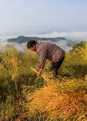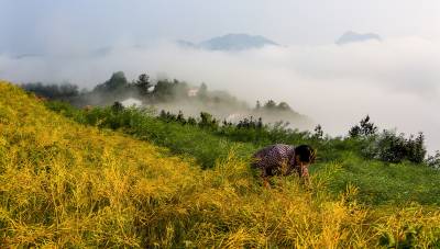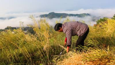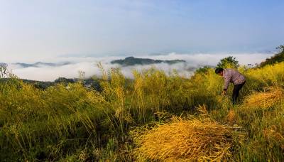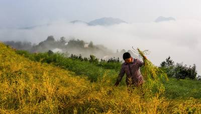 2016年4月28日,竹溪县县河镇马鹿山(安家沟村)留守妇女吴志秀正在收割她家自留地金灿灿的油菜籽。 竹溪县20余万亩油茶今日开镰收割。竹溪县县河镇马鹿山常年四季无论天晴下雨都呈现不同宛如人间仙境的云海画面,马鹿山村民常年在美如人间仙境似的自然环境中开心快乐的劳作和收获(视界网温大树摄)。