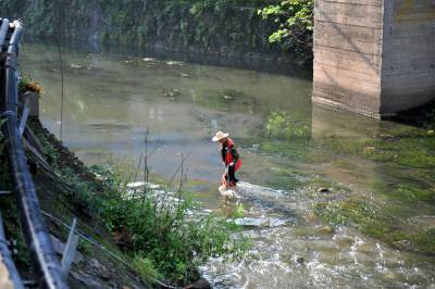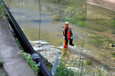 2016年4月21日清晨,宜昌市夷陵区一名环卫工人脱掉套鞋,赤足入水在小溪塔城区的罗家小河里捡拾垃圾。五一劳动节到来,为默默奉献的劳动者点赞!视界网 张国荣 摄