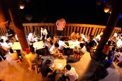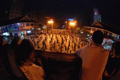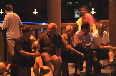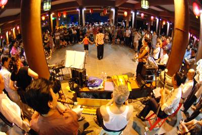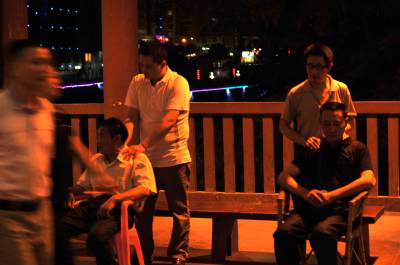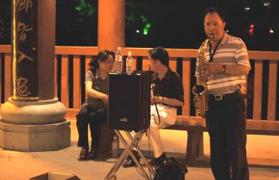6月15日晚,恩施州城风雨桥上歌声飞扬,一支由退休老人组成的乐队正在激情演奏(图一),赢得了市民的阵阵掌声。据了解,该乐队每天晚上都会在此为市民们义务演出,他们当晚的演出就是为了庆祝端午节的到来。具有侗族建筑风格的风雨桥,每到夜晚便越发流光溢彩,成为市民纳凉休闲的一个重要地方,市民们在桥上打牌(图二)、跳舞(图三),甚至还有人摆起了按摩理疗的摊子(图四),整个风雨桥上呈现出一幅美丽的流动画面。