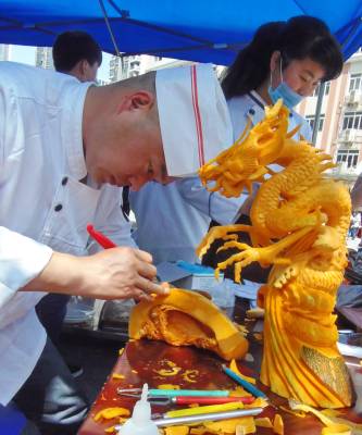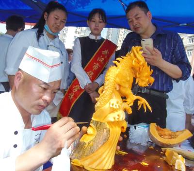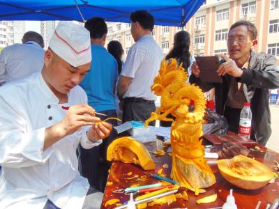 4月30日,为方便6万初中毕业生考生理性选择合适学校,武汉市在全市统一举办9场中招咨询活动,方便考生和家长,利用"五-"小长假,到各区现场面对面地与区教育局、招生办、学校招生老师进行交流。指导考生和家长,5月5日8:00至9日20:00,在网上慎重填报中考志愿。当日上午,在市十九中的江汉区中招咨询活动现场,武汉市旅游学校烹饪教师、省烹饪大师杨连军,在现场用南瓜雕刻了榻榻如生、活灵活现、人见人爱的中国龙,展现了教书育人工匠的劳动风采,同时,祝贺考生家长和老师们,"五-"小长假愉快。