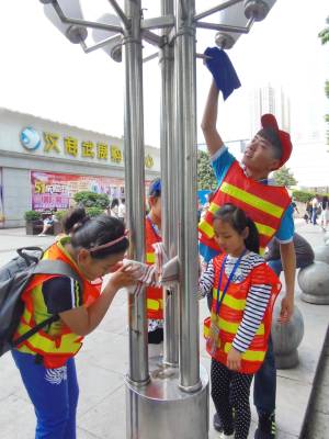 5月1日上午,20余名来自武汉轻工大学大学生自愿者和冮汉区汉口辅仁小学小学生,-起来到了汉口解放大道商业圈的街头巷尾,到冮汉区城管委清扫二队,为环卫工顶班劳动庆"五-"。他们经过了清冼路面拾捡垃圾洗抹电杆等力所能及的环卫保洁劳动,体验到了环卫工人劳动的艰辛,要在日常生活中,要珍爱城市环境,珍惜环卫工的劳动。图为大小学生自愿者,在武展路旁洗抺路灯杆。