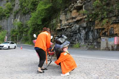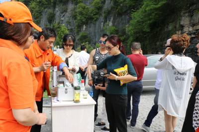 五一小长假,五峰公路养护部门志愿者在325省道K150千丈岩港湾式停车带开展便民服务活动,为过往的近2000名名外来游客奉上开水、凉茶、药品等物品,树立五峰生态旅游新形象。(视界网 杨威 陈艳君 摄)