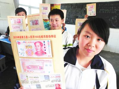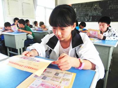 爱人民币抵制假钞 5月3日,湖北省十堰市郧阳区青曲镇初级中学的学生在学习鉴别真假人民币的方法。该校以班队会的方式开展了以“爱护人民币,自觉抵制假币”为主题的活动,向学生介绍了人民币的发行历史,详细讲解了第五套人民币的特征与识别方法,教育学生从小养成爱护人民币、反假人民币意识,达到“教会一个学生带动一个家庭,实现人民币知识走进千家万户”的宣传目标。 (视界网 张传郧 湖北省十堰市郧阳区青曲镇初级中学 13635714262 442531)