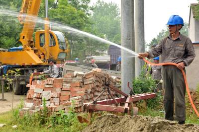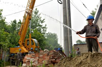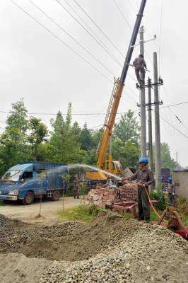 5月11日上午,在老河口市仙人渡镇范湾村3号台区的农网改造施工现场,电力施工人员正在对沙石、水泥进行浇水混合,按照固定比例制作混凝土,用于固定电杆的杆窝基础。在配电网建设与改造过程中,老河口市供电公司要求现场工作负责人严格把关,确保混凝土比例符合规定,为立杆打好基础。