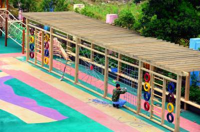 5月11日,工人正在宣恩县民族幼儿园安装幼儿游乐设施。该院购买了滑梯、攀爬绳、小木马等各式游乐设施,为幼儿增添娱乐游玩项目。近年来,宣恩县积极采取各项措施,大力改善办学条件,努力为教育发展创造良好的基础环境。
