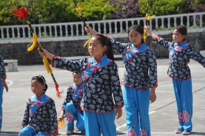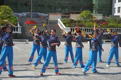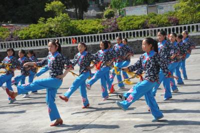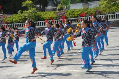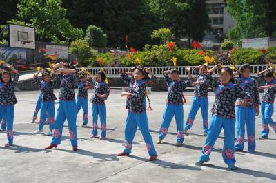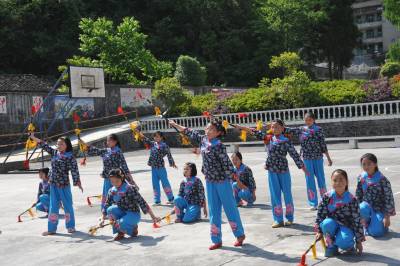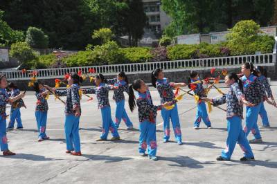 5月12日,鹤峰县中营镇民族中心学校的学生训练连响舞。 近年来,该县各中小学广泛开展民族文化进校园活动,白族舞“霸王鞭”、土家“摆手舞”、连响舞、山民歌等乡土民间文化得以重返校园,极大丰富了学生阳光体育大课间活动,弘扬优秀民族文化。