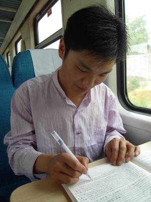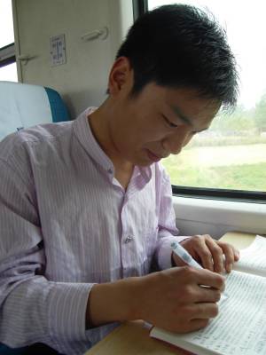 2008年度”中国大学生自强之星”并荣获”中国大学生新东方自强奖学金”的青海大学周广林同学,6月16日中午,从青海一路辗转,乘坐K279次旅客列车赶至湖北襄樊,参加于6月17日举行的襄樊大学生村官的面试。据了解,周广林同学已经顺利通过了在武汉湖北大学的笔试程序,顺利进入面试阶段。面对面试程序,身为中共党员和学生干部的周广林满怀信心,抱着浓浓农民儿子的情愫,投身西部,扎根基层,愿为襄樊新农村建设奉献出自己的热血青春。图为周广林同学在列车上还不忘复习梳理应考内容。
