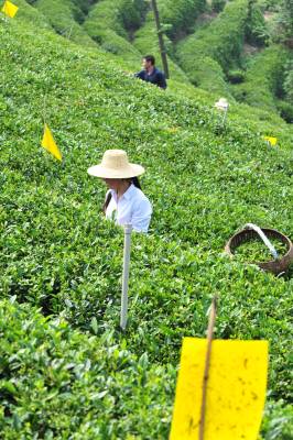 湖北省宜昌市夷陵区是产茶大区,该区近年来整村推进建设高效生态茶园,在茶区广泛全面推广生物杀虫技术,茶园装上了诱蛾杀虫灯和生物杀虫纸,目前已发展生态茶园17万亩,产量9151吨,茶产业收入3.1亿元,茶农年收入5000元以上的有15000多户。本报视界网张国荣摄