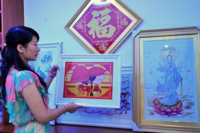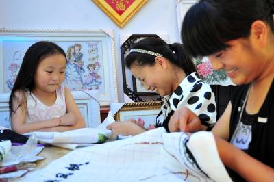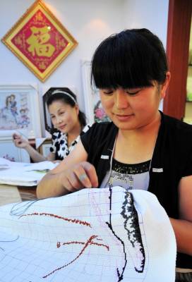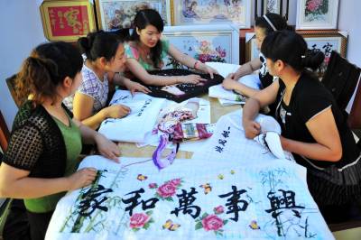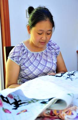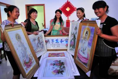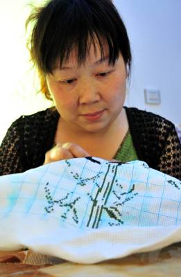 2010年6月17日,在三峡工程大坝左岸坝头的湖北省宜昌市夷陵区太平溪镇许家冲村,三峡移民妇女谢蓉等聚集在一起缝制”十字绣”。 今年4月底,宜昌市夷陵区在许家冲村开展新型农民教育活动以来,该村30多名移民妇女空闲时聚在一起,穿针引线绣已出”十字绣”作品50多幅,用灵巧的双手”绣”出了美好新生活。她们巧手绣出的”十字绣”作品有的被欣赏三峡美景的游客留着了纪念,有的被自己作为装饰家居之用。本报视界网张国荣摄