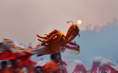 常言说正月十五玩龙灯.这是侗家青年玩龙灯的情景.朦胧的雾气中透露出正落山的圆圆太阳.似乎金龙嘴里吐出的珠子。