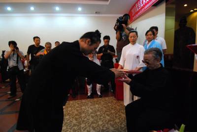 武当山武术界”消失”多年的传统拜师仪式6月20日在丹江口市华文宾馆重现。30多位武当武术弟子拜首批国家级非物质文化遗产武当武术代表性传承人、武当太乙五行拳传人、武当山道教武术总教练、武当山剑英国术馆馆长赵剑英为师。整个拜师仪式按照古时拜师礼的程式进行,师长代表宣读拜师帖、徒弟敬茶拜师、师父授剑、签拜师帖、师父训示等。赵剑英今年86岁,她说通过此次仪式把门下弟子聚集起来,共襄武当武术传承大计,让更多的人了解武当武术、热爱武当武术,将国粹传承的接力棒很好的交接下去,发扬光大。