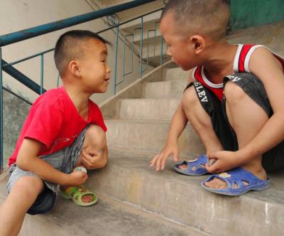 这是郧县刘洞镇九年一贯制学校的两个教师的孩子,本周末在楼梯间里玩”标牌”游戏,一个输了不愿给牌,正在斗嘴:”凭啥不给,赖皮!赖皮!”