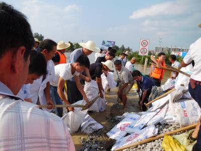 7月21日下午,孝南区杨店镇54名村支部书记组成的老支书方阵鏖战在107国道东山头段。这个由杨店镇54名村支书组成的抢险抗灾方阵平均年龄超过50岁,却以干劲足、筑堤技术和经验丰富成为该镇百人民兵应急分队的主心骨。图为老支书们带领青年民兵灌装筑堤现场。