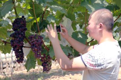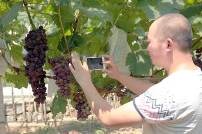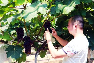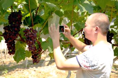 “互联网+”葡萄销售 23日,巴东县官渡口镇 “西溪坝葡萄专业合作社”业主、28岁的返乡青年伍海贤正在葡萄园中一边用手机拍照一边用微信发布。 该合作社由伍海贤于2011年创建,现发展葡萄280亩,其中100多亩使用避雨栽培模式。今年120多亩丰产,伍海贤在葡萄园中设置5个探头,通过互联网+微信平台,力争让自己的葡萄走得更远,目前,他在微信上多次发布葡萄长势,网上已签下了近万斤葡萄的销售订单。(视界网穆世祝摄)巴东县官渡口镇中心学校(444309)