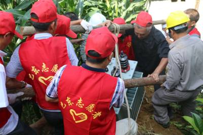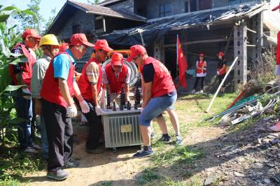 救灾,党团员战斗在一线 7月23日,鲜艳的党旗下,党团救灾队的队员正在搬运变压器。 当天,由巴东县委组织部、团县委、地税局党团员组成的救灾分队扛着党旗,穿着志愿者的红马甲来到巴东县金果坪乡长冲村,协助国网巴东供电公司抢修因“7.19”暴雨停电的供电线路,随着长冲村6组最后一个台区恢复供电,该乡“7.19”暴雨停电的96个农村台区,5728户的用电全部恢复。 巴东县金果坪乡政府 陈祥楚 郑建敏