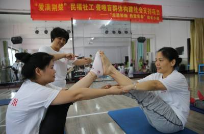 7月24日,在襄阳市民福社会工作服务中心志愿者的引导下,36名聋哑人、6名盲人学习瑜伽,感受瑜伽带来的健康和快乐。当天,襄阳市民福社会工作服务中心“走进瑜伽 热爱生命”聋哑盲群体瑜伽课堂正式开课,瑜伽义务培训持续两个月。因视力或听力等感官上的障碍,盲聋哑群体天生敏威、身体僵硬,因而这类群体大多封闭自已,为了这庞大对象在身体上得到舒展从而心理上得到释放,襄阳市民福社会工作服务中心和公益社团合作,将瑜伽引进入特殊群体的生活,在放松状态中为特殊群体搭建互动交流的平台,促使他们身心舒畅。