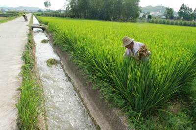 房县小水利惠及农业增效农民增收 7月24日,房县军店镇下茅坪村农民杨树沛在锄稻田杂草。该县以粮食增效、农民增收为目标,建设一批蓄水、保水的高效节水渠道,除险加固重点水库。近5年,完成新修节渠道512公里,除险加固水库59座,新修和改善农田灌溉面积8.5万亩,项目区年增产粮食1120万吨,农民实现人均收入达到5793元。 本报视界网 张启龙 摄 湖北房县水务局 张启龙 邮编:442100 电话:0719-3247077 手机:18963936018