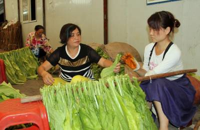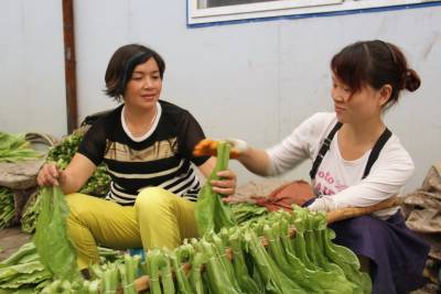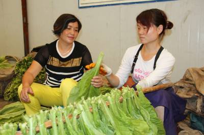 7月25日,咸丰县烟叶分公司共产党员、生产科副科长胡红梅(左)在帮助丁寨乡高山羊村1组残疾姑娘向利编烟,增加务工收入。该县党员干部职工在指导农民发展产业脱贫致富的同时,还积极为残疾人、缺少劳动力的种养职业专业户提供劳动帮助,增加经济收入脱贫致富。