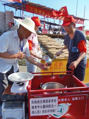 7月25日下午,湖北省武汊市高温己达38度以上,江汉区民族街炎黄居家养老服务中心的两位学雷锋志愿者,冒着骄阳似火,酷暑热天,为满春民族民权花楼水塔等4条街的18个闸口防汛值守人员,兔费送上防暑降温绿豆汤。自防汛的7月份以来,一直没有间断过,骑着装有爱心的绿豆汤,奔走在2.3公里长的大堤闸口旁。