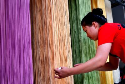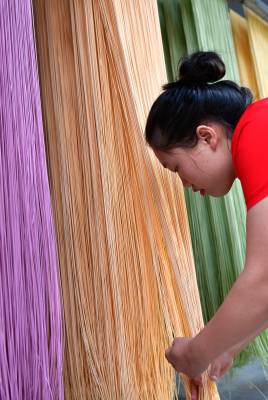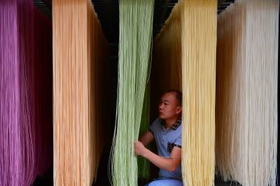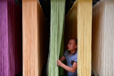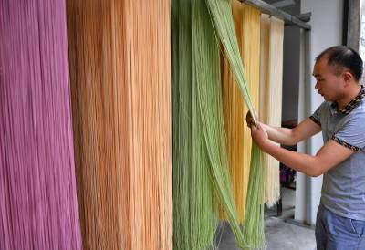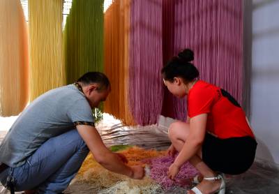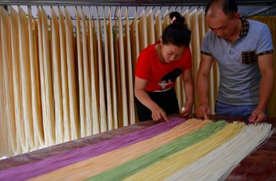 7月27日,宣恩县农民肖辉、罗晓庆夫妻俩在加工、晾晒“七彩蔬菜面”。
