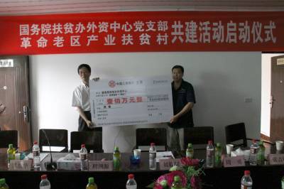 上下结对促党建(图)6月21日,在”革命老区产业扶贫村共建活动”启动仪式上,国务院扶贫办外资中心党支部副书记、副主任刘毅韬(左)向浠水县汪家岗村党支部书记蔡明智(右)转交100万元捐赠支票。该活动主旨是:结合扶贫工作,以”双强工程”为目标,以”五个基本建设”为内容,通过三年的结对共建,在”围绕经济抓党建,抓好党建促发展”工作模式方面进行有益探索。中国社会科学杂志副总编周溯源、中国延安精神研究会理事张吉明及省市县有关领导出席了活动。通讯员王峰