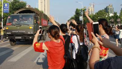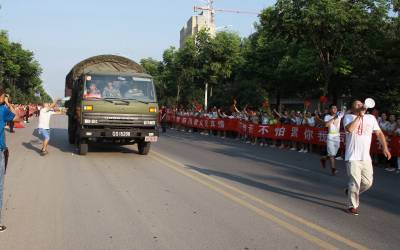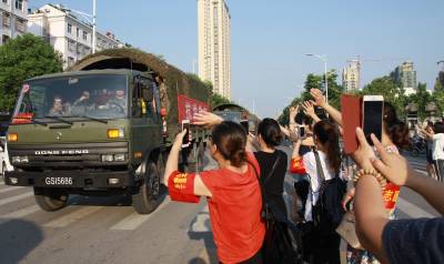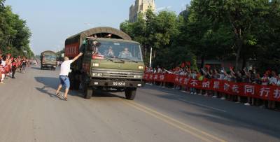 28日,天门市干部群众分别在城区和胡市镇举行了欢送驰援天门抗洪救灾的部队官兵胜利返程活动。7月19日以来,受强降雨和上游来水影响,天门市汉北河流域汛情危急,人民群众的生命财产安全受到严重威胁。危急关头,空降兵某部500余名官兵和中部战区陆军某舟桥旅600名官兵当地湖北某陆军预备役舟桥团、天门市人武部、民警、路政等部门紧急驰援,期间,官兵们冒着高温酷暑,奋战在一线大堤,军民联合,万众一心,用血肉之躯保护了天门人民的家园,用实际行动谱写了一曲人民军队爱人民的时代壮歌。(本报视界网刘银斌摄)