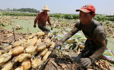 7月29日,襄阳市襄城区尹集乡姚庵村种植户正忙着采收鲜藕。与一般在秋末成熟的莲藕相比,夏季莲藕看起来比较纤细,口感脆嫩,售价不低,利润可观。 (视界网杨东摄)