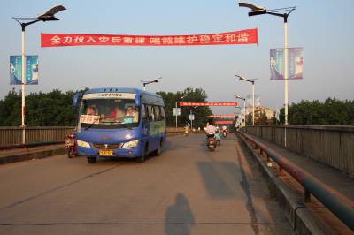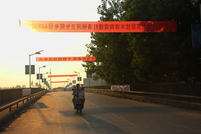 2016年07月29日,云梦县清明河大桥上“重建家园”的横幅。