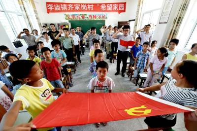 2016年7月29日上午,共产党员面向党旗庄严宣誓。当日,湖北省南漳县团委在李庙镇“希望家园”所在地——李庙镇闫坪中学,组织开展一次别开生面的支部主题党日活动。全体团县委机关党员、李庙镇希望家园流动支部党员、十二个镇区团委书记同时参加活动。30多名“希望家园”留守儿童观摩学习。团县委按照“7+X”要求完成规定动作,并在自选动作中结合团委职能,邀请博士团成员程志远专题讲座“青年跟党走,扶贫志先行”为留守儿童“送希望”;消防战士从日常防火注意事项、灭火器正确使用等角度为留守儿童“送安全”;青年志愿者党员通过PPT生动讲述道德礼仪课为留守儿童“送知识”。
