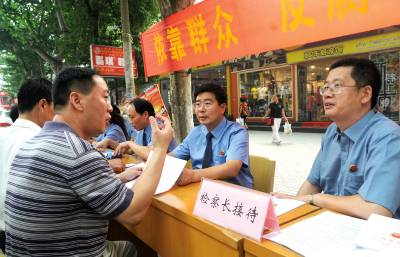 依靠群众反腐倡廉22日,根据最高人民检察院统一部署,黄石市检察院10余名干警在交通路开展举报宣传活动,拉开了为期一周的以”依靠群众,反腐倡廉,服务大局”为主题的举报宣传周活动的序幕。当日,全市各区检察机关共有70余名干警深入农村、社区和街道开展此项活动,共接待群众咨询150余人次,受理群众举报18件次,分发举报材料1200份。图为市检察院检察长杨武力(右二)正在接待群众来访。黄石市黄石日报摄影部邱孝威摄电话:13807232603邮编:435002