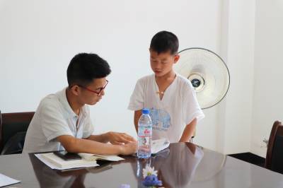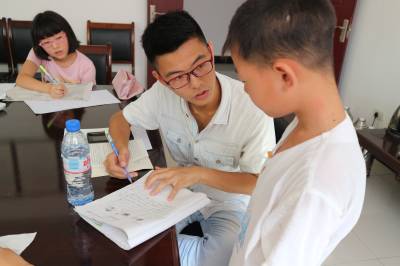 今年暑假,宜昌市夷陵区黄花镇上洋村委会开展“关爱留守儿童”活动,上洋村的准大学生主动报名参加志愿服务,为家乡山村的留守儿童送文化知识。图为7月31日,已被江汉大学录取的左鹏程为上洋村的留守儿童辅导作业功课。