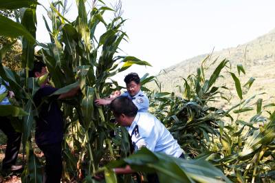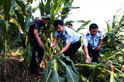 7月31日,在秭归县沙镇溪镇大浴池村八组,秭归县公安局政委胡俊率领民警救灾分队,向年近七旬、子女不在身边的周祖强老人伸出援手,将其倒伏面积近一亩、其中尚未断裂的玉米全部扶正,尽量减小其灾后损失。7月29日18时许,秭归县沙镇溪镇大浴池村等15个自然村遭遇大风冰雹袭击,造成农民大量房屋受损、大片玉米倒伏等重大灾害损失。灾害发生后,秭归县委、县政府连夜组织县直机关干部紧急赶赴灾区,帮助当地干部开展灾后救援、灾后安置、灾后核查,帮助当地灾民开展灾后自救和灾后重建。(视界网吴令剑摄)