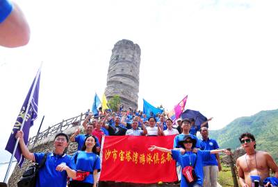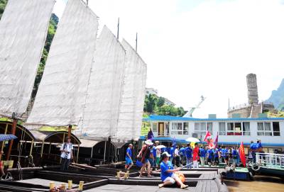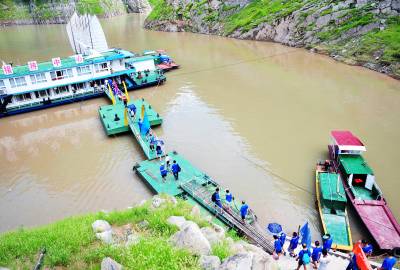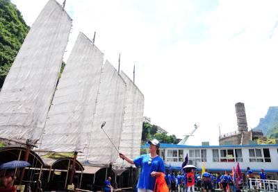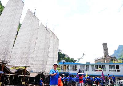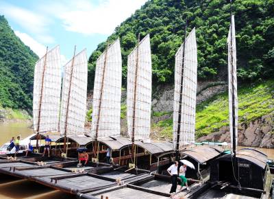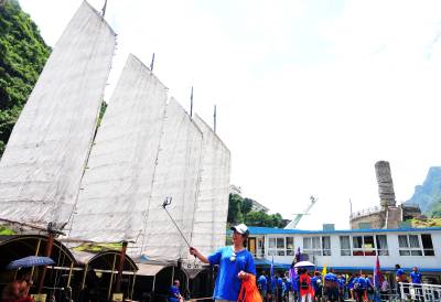 秘境巴东旅游也升温 30日,游客在巴东县链子溪4A级景区柏木帆船和纤夫石前拍照留影。