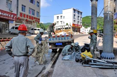 8月14日,骄阳似火,酷热难当。在巴东县革命老区--溪丘湾乡集镇网改工地,7个施工班组100多名网改大军在组立电杆、安装金具、架设供电线路,5名公安民警蹲守作业现场维护秩序,疏导集镇交通,工地一片繁忙。