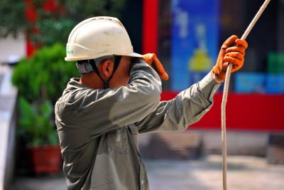 在长途汽车站旁,2名施工队员在吊车的协助下安装爬梯。交叉路口处,一字排列的 5根水泥杆上队员们在忙着上金具,不时传来扳手拧螺丝与横担碰击的声音。地面上,2名打临工的队员一会儿为杆上的队员传递瓷瓶,一会儿拖着长长的牵引绳,一处处地翻越密如蛛网的弱电线路,为牵引绝缘导线做准备。