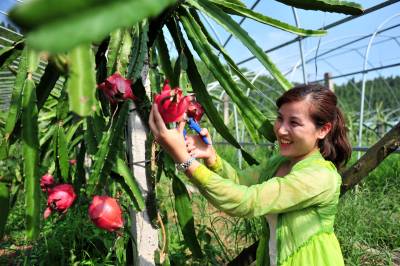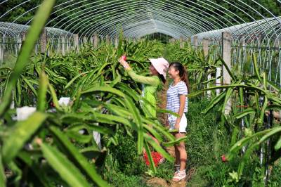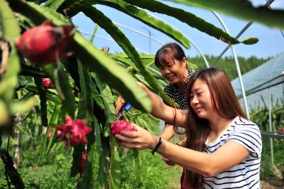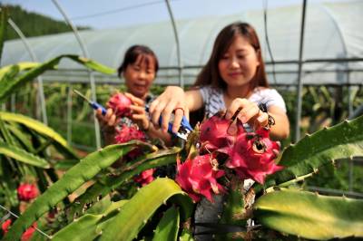 2014年,雷家畈村村民杜万华、杜万寿等通过流转20多户农民的承包地,成立宜昌首家火龙果专业合作社,建成以“台农4号”红心火龙果种植、采摘、销售,以及休闲为一体的现代设施农业生态观光园60亩。去年以来,基地的火龙果6至11月次第开花结果,亩产鲜果达2500公斤,年收入超过100万元。目前,当地村民流转给合作社的承包地不仅每年有固定的收入,还有20多人吸纳为社员,常年在家门口的合作社里打工,增加了额外的劳务收入。视界网 张国荣 摄