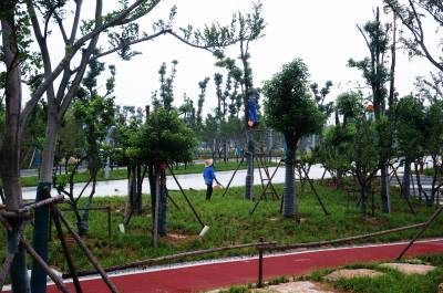 8月17日,园林工人正在湖北省十堰市郧阳区汉江南岸进一步完善细化"水利工程文化园"建设,标志着以"水利"为主题的文化公园在南水北调中线工程水源区落成。"水利"主题公园为"中华水园"建设中的一部分,该公园位于汉江南岸临江区域,全长5公里,占地面积3300多亩。其中包括,桥头公园、水利工程文化园、湿地公园和解放军青年林公园等4个景点。中华水园建成后,将为广大市民和游客提供一个集亲水、观光、旅游、休闲为一体的大型临江公园。 视界网周家山 摄