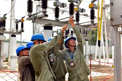 8月18日,在襄阳老河口市革命老区袁冲乡,来自老河口市供电公司检修建设工区的施工人员正在对35千伏袁冲变电站的袁1号主变压器的高、低压侧导线及中央龙门架架空线进行更换,进一步提升该变电站的安全可靠运行能力,服务革命老区经济发展。