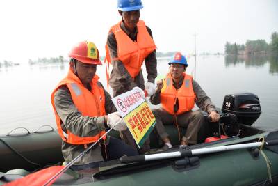 水中挂牌防触电 7月底,应城市老观湖堤溃口后,致使龙赛湖区域49平方公里被淹没,集水达2.04亿立方米。根据应城市防汛指挥部指令,该公司在张集、移北、王台、龙湖、三台湖等五个泵站排涝处临时安装5台1000千伏安变压器。为了确保正常排渍供电,突击队员对浸于水中的10千伏义和二回线路设备上悬挂警戒线和安全标识。8月16日,应城供电公司突击队员乘坐快艇在龙赛区淹没水域挂安全标识。 李文勇