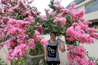 8月18日,竹山县大庙乡黄土梁村一组农民吴雪芳正在拍摄自家门前花团锦簇的紫薇花。近年来,该县结合美丽新村、绿色新村、生态新村和“内修人文,外修生态”建设,有效实施山绿、路绿、河绿、城绿、园绿、村绿、院绿、地绿“八绿”工程,倡导农民做好自家庭院、房前屋后的绿化、亮化、美化、香化工作,加大植树增绿力度,不断提高绿色家园的绿化水平和景观品质,为改善空气质量提供正能量,提升群众幸福生活指数。
