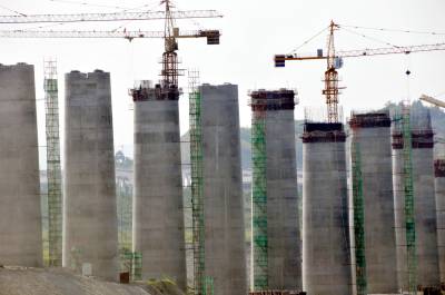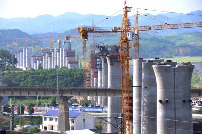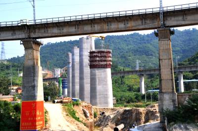 8月20日,建设者冒着高温加快建没的丹江囗市六里坪镇跨"襄渝"铁路高铁特大桥。"汉十"高铁六里坪跨"襄渝"铁路高铁特大桥全长1957.59米,由58个桥墩组成。线路靠近马家岗村、蒿口村移民区,东西横跨"襄渝"铁路捻沟特大桥。"汉十"高铁全长395.1公里,全线共有14个车站,设计时速350公里,总投资527.5亿元。由铁四院总体设计,全线共有233座桥梁,46座隧道,桥隧总长274公里。2015年12月3日全线开工,2018年将建成通车,通车后110分钟即可从武汉市到达十堰市。