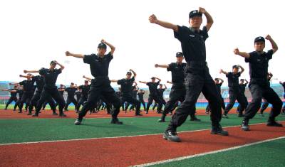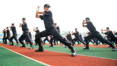 6月22日,特警队员正在进行擒敌拳训练。为切实担负起防暴处突任务,让特警成为”文武双全”的尖兵,恩施市公安局特警大队67名特警开展”轮训轮值、战训合一”大练兵活动。练兵活动中,特警们将开展法律知识讲座、技能战术训练、体能训练等九项训练。