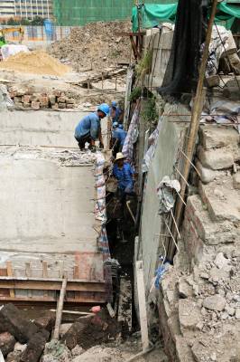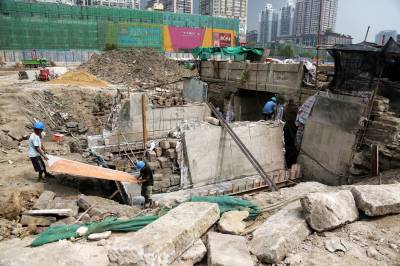 23日,笔者从汉口长堤街进入打围封闭的银丰片,看见几名工人正在对保寿硚采用水泥“现浇”加固。据“天演平移公司”刘姓施工人员介绍,,保寿硚将于下月向西南方向平移20米至围墙处,明年7月再迁回原址。