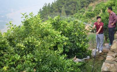 8月25日,巴东县东瀼口镇农业服务中心技术员正在绿竹筏绿生果树种植专业合作社检查指导柑橘抗旱保果。 该镇现有24000多亩柑橘进入丰产期,是农民增收脱贫的主导产业,近20多天持续高温少雨,大部分橘园遭受损失。连日来,中心技术员分片包干,责任到人,进户入园检查灾情,指导橘农采取剪去枯枝败叶、摘除劣质果子、浇水降温等措施抗灾自救。 (巴东县官渡口镇政府 向传辉摄 电话 18963928551)